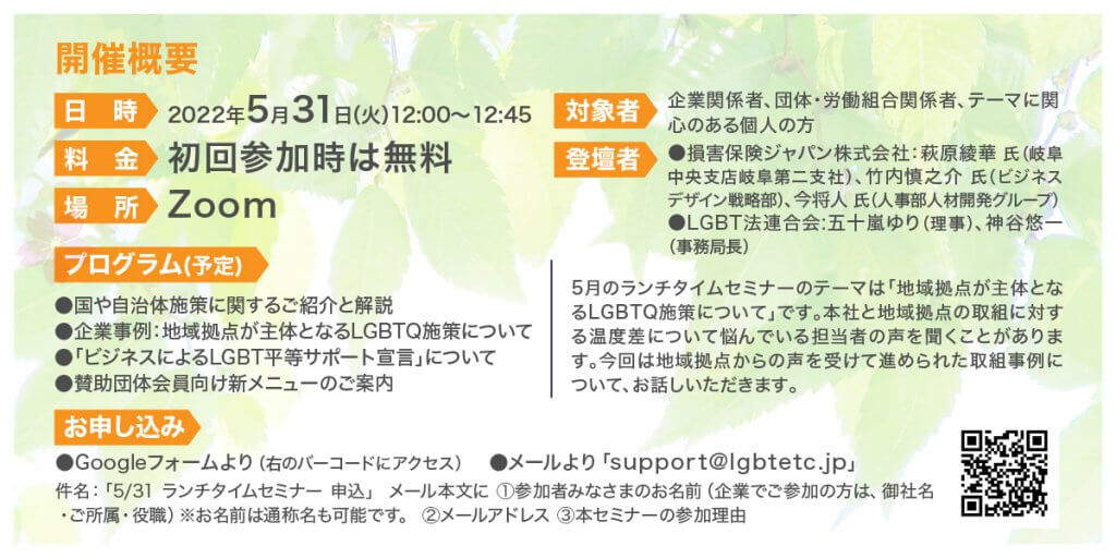 5月のランチタイムセミナーのテーマは「地域拠点が主体となるLGBTQ施策について」です。本社と地域拠点の取組に対する温度差について悩んでいる担当者の声を聞くことがあります。今回は地域拠点からの声を受けて進められた取組事例について、お話しいただきます。