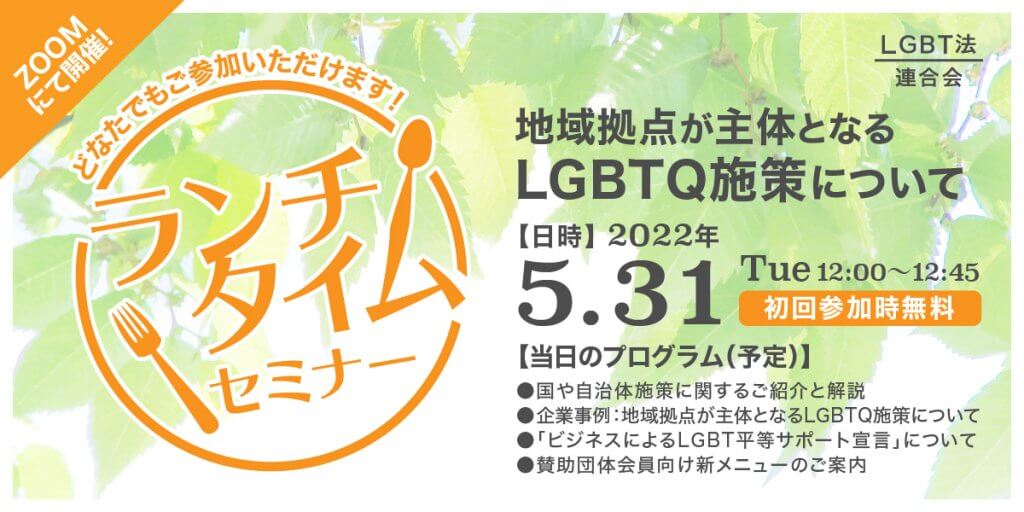 理事を務めるLGBT法連合会主催「ランチタイムセミナー」が、5/31(火)12時より開催されます。